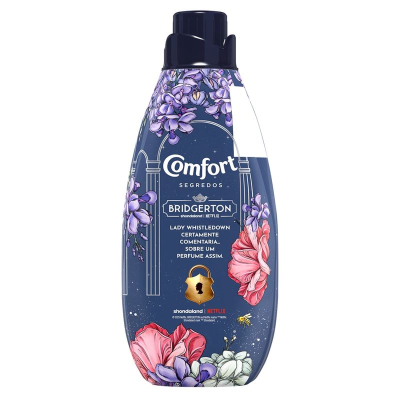 O Amaciante Concentrado Comfort Segredos Bridgerton possui um perfume misterioso, para que descubra o segredo mais perfumado da realeza. Desenvolvido em Edição Especial em parceria com a Netflix, este amaciante de roupas concentrado possui um perfume exclusivo que reúne os ingredientes mais requintados da perfumaria fina, que garantem uma fragrância sofisticada e marcante. O amaciante de roupas Comfort Segredos Bridgerton garante longa fixação dos perfumes, para que suas roupas fiquem perfumadas por muito mais tempo. Além de cuidar e fixar o perfume em suas roupas, o amaciante Comfort Segredos garante maciez aos tecidos, para roupas sempre impecáveis. Por ser concentrado, menos de meia tampinha basta para descobrir o segredo mais perfumado da realeza: para máquinas até 8 kg ou lavagem à mão, dosar menos de 1/3 da tampa (20 ml). Rende muito mais! Comfort Segredos concentrado possui perfume encapsulado que penetra no tecido durante o processo de lavagem de roupa, deixando-a muito mais cheirosa até mesmo depois de seca! O motivo? Quando você se movimenta, essas cápsulas de perfume se rompem e liberam essa fragrância misteriosa e incrível, fazendo com que aquele cheiro de perfumaria fina dure muito mais! Experimente Comfort Bridgerton Edição Especial: o segredo mais perfumado da realeza.