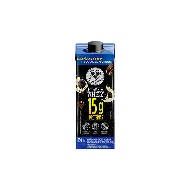 Unindo o sabor e a cremosidade do Cappuccino 3 Corações com 15g de proteína, sem adição de açúcares, zero lactose e com o irresistível sabor de Cookies'n Cream.