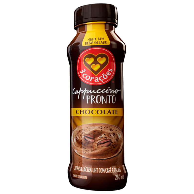 Todo sabor do Cappuccino Classic com um toque generoso de cacau e o melhor de tudo: PRONTO para beber. Ingredientes : Leite pasteurizado integral, calda de cacau (água e cacau), composto lácteo com café (leite em pó integral, açúcar, soro de leite em pó, café solúvel e estabilizante citrato de sódio), açúcar, soro de leite em pó, dextrose, emulsificantes: carboximetilcelulose sódica, celulose microcristalina e carragena e estabilizante fosfato trissódico.