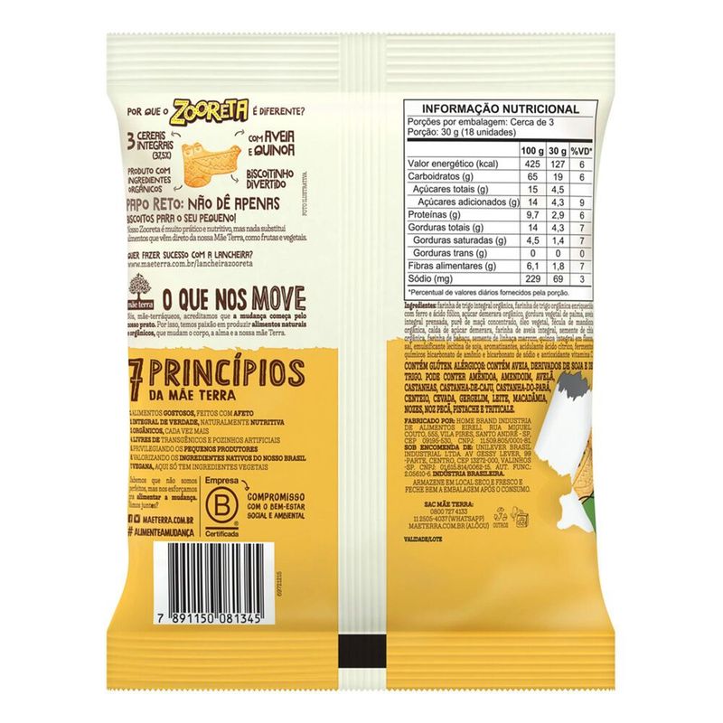 • O Biscoito Mãe Terra Zooreta Maisena com Aveia e Quinoa é um snack infantil orgânico, divertido e saudável, com mix de grãos nutritivos perfeito para o lanchinho das crianças • O Biscoito Mãe Terra é preparado com mix de grãos integrais e nutritivos, tais como chia, quinoa e linhaça, somente com ingredientes naturais, livre de pozinhos artificiais • O biscoito integral é preparado com 3 cereais integrais (37,5%) que preservam todas as suas partes nutritivas e sementes • Os biscoitos vêm no formato super divertido de jacaré. Seus pequenos vão amar • O Biscoito Mãe Terra Zooreta Maisena com Aveia e Quinoa é um snack prático, nutritivo e divertido, perfeito para colocar na lancheira das crianças e para ser consumido em qualquer momento do dia • Nós, mãe-terráqueos, acreditamos que a mudança começa pelo nosso prato. Por isso, temos paixão em produzir alimentos naturais, saudáveis e orgânicos que mudam o corpo, a alma e a nossa mãe Terra Nosso Biscoito Mãe Terra Zooreta Maisena com Aveia e Quinoa é uma opção prática de snack saudável e delicioso para as crianças. É um biscoito vegano, orgânico e com mix de grãos nutritivos como aveia, quinoa, chia e linhaça. Esse snack infantil vem no formato super divertido de jacaré. Seus pequenos vão amar! É livre de pozinhos e aromas artificiais e feito com farinha de trigo integral de verdade, moída em nossa fábrica a partir do grão orgânico inteirinho, preservando tudo que tem de bom ali para você consumir. Isso só mostra que é possível unir nutrição e muito sabor em uma coisa só! Deixa qualquer lanche das crianças mais nutritivo, divertido e saboroso, sem deixar a saúde de lado, e ainda dá aquela energia para o dia a dia! O Biscoito Mãe Terra Zooreta Maisena com Aveia e Quinoa é livre de ingredientes geneticamente modificados. Fundada em 1979, a Mãe Terra é líder no segmento de alimentos naturais e orgânicos no Brasil. E é com muita alegria que podemos dizer que somos uma Empresa B, comunidade global de organizações que buscam o desenvolvimento socioambiental, além de econômico. Temos o desafio de crescer, mas sempre respeitando os limites da natureza, valorizando a preservação ambiental e com cuidado social. Ser parte desse movimento nos mostra que estamos no caminho certo. Nós, mãe-terráqueos, acreditamos que a mudança começa pelo nosso prato. Por isso, temos paixão em produzir alimentos naturais e orgânicos que mudam o corpo, a alma e a nossa mãe Terra. Os 7 princípios da Mãe Terra são: 1. Alimentos gostosos, feitos com afeto; 2. Integral de verdade, naturalmente nutritiva; 3. Orgânicos, cada vez mais; 4. Livres de transgênicos e pozinhos artificiais; 5. Privilegiando os pequenos produtores; 6. Valorizando os ingredientes nativos do nosso Brasil; 7. Vegana, aqui só tem ingredientes vegetais. Sabemos que não somos perfeitos, mas nos esforçamos para fazer nossa parte. Vamos juntes? #AlimenteaMudança