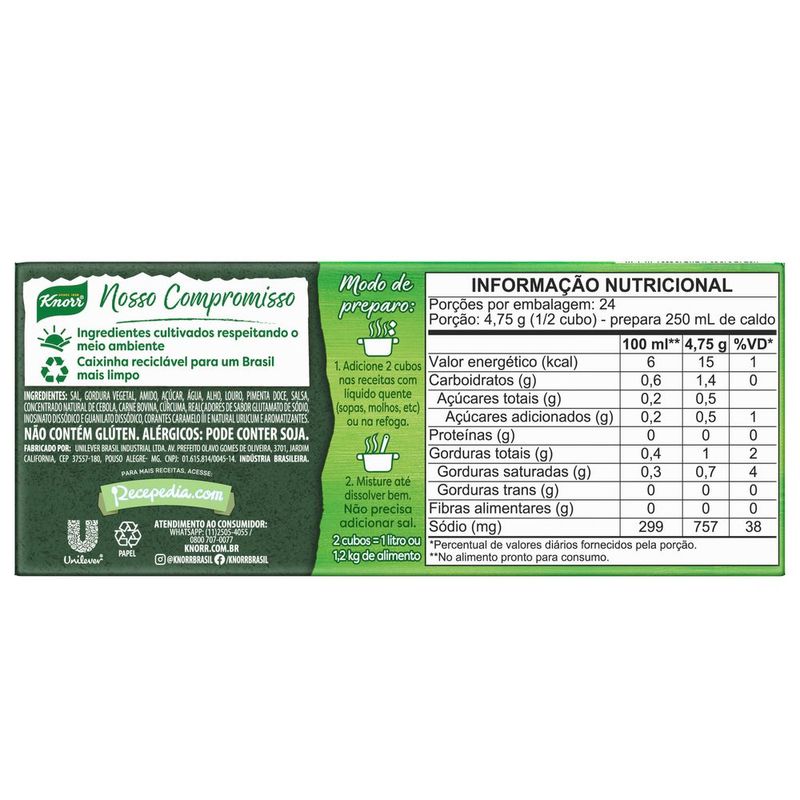 Caldo Knorr Carne traz mais sabor e cor às suas receitas, deixando seu prato com um tempero ainda mais especial! Estes cubos de caldo são feitos com sal na medida certa, e com ervas e especiarias cuidadosamente selecionadas, como alho, louro, pimenta vermelha, salsa, concentrado natural de cebola e cúrcuma. A seleção minuciosa de ingredientes é o primeiro passo para a criação dos produtos Knorr e a preservação do sabor das ervas e vegetais, tratados com tanto carinho desde as fazendas até a nossa fábrica, é resultado do processo de desidratação, um sistema simples e seguro para retirada de água dos alimentos. Esta é uma metodologia bastante antiga, que serve como alternativa à aplicação de conservantes e indica o uso de ingredientes de verdade! Além disso, o produto é extremamente versátil e muito fácil de ser usado: utilize 1 cubo de caldo Knorr para cada 600 g de alimento ou 500 ml de líquido quente, misture bem até dissolver e pronto! Não precisa adicionar sal: os produtos foram desenvolvidos para ajudar o seu dia a dia na cozinha e sua receita já contará com todo o sabor e aroma de Knorr, com o sal na medida. O nosso caldo é perfeito para temperar carne! Que tal preparar uma deliciosa lasanha à bolonhesa ou uma carne ensopada com o Caldo Carne? Os Caldos Knorr são bons para você e bons para o planeta, uma vez que possuem ingredientes cultivados respeitando ao meio ambiente, embalagem reciclável e são produzidos em uma fábrica com zero emissão de gás carbônico! Conheça toda a nossa linha de caldos Knorr, Mais Sabor e Sal na Medida Certa!