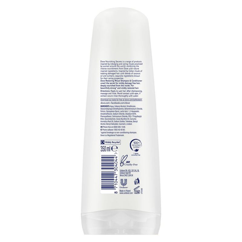 • O Condicionador Dove Ritual de Reparação possui a nova fórmula com óleo de coco e cúrcuma para deixar seus cabelos mais fortes e resistentes ao dano* • Condicionador ideal para cabelos danificados, pois nutre profundamente e traz de volta a beleza e força aos seus cabelos • A fórmula deste creme para cabelo contém óleo de coco e cúrcuma, ingredientes conhecidos por suas propriedades reparadoras que ajudam a deixar os cabelos fortes • O Condicionador Dove Ritual de Reparação deixa seus fios muito mais saudáveis e nutridos diariamente • Após a lavagem, coloque condicionador na mão e aplique diretamente nos cabelos molhados. Passe por toda a extensão dos fios, concentrando mais nas pontas e depois desembarace suavemente • Com o uso do Condicionador Dove Ritual de Reparação seus cabelos vão ficar mais fortes, nutridos e resistentes aos danos* diários Dove Nutritive Secrets é uma linha de produtos inspirada nos rituais de cuidados com os cabelos praticados pelas mulheres ao redor do mundo, combinando a nutrição de Dove com o poder da natureza. O Condicionador Dove Ritual de Reparação foi inspirado nos Rituais da Índia de tratar os cabelos danificados com óleo de coco e cúrcuma. A linha Dove Ritual de Reparação deixa seus fios muito mais saudáveis e traz de volta a beleza e força aos seus cabelos. Chega de cabelos danificados! O óleo de coco e a cúrcuma são ingredientes muito conhecidos por fazerem parte de rituais de beleza em todo o mundo, pois os dois tem propriedades reparadoras que dão um maior efeito combinado, com o também famoso poder nutritivo de Dove, proporcionando nutrição para cabelo. Dove acredita na real beleza e aposta na diversidade de todas as mulheres. Seu cabelo é lindo do jeito que você quiser! Há muito poder em cabelos bonitos! Toda a linha Dove possui hidratante, deixando seu cabelo ainda mais radiante. Use em seu dia-a-dia para evitar danos futuros e sentir resultados ainda melhores. Comece a usar e sinta a diferença. Dúvidas de como usar? É simples e prático: coloque o Condicionador Dove Ritual de Reparação nas mãos e aplique-o diretamente nos cabelos molhados após a lavagem com o shampoo, aplique por toda a extensão dos fios, concentrando mais nas pontas, e depois desembarace suavemente, da forma que preferir. Dove é certificada Cruelty-Free pela PETA, sendo assim, não realizamos e nem realizaremos testes em animais em nenhum lugar do mundo. *Estudo técnico de redução de quebra usando shampoo e condicionador Dove Ritual de Reparação comparado com shampoo sem agentes condicionantes.
