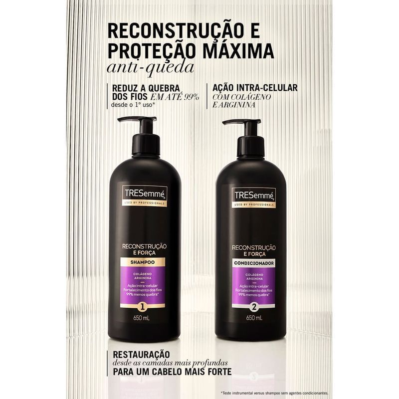 Tenha cabelos mais fortalecidos e com menos quebras desde o primeiro uso! Conheça a linha TRESemmé Reconstrução e Força que reduz a quebra dos fios em até 99% desde o primeiro uso*. Com a avançada tecnologia de ação intracelular, seus cabelos ficarão visivelmente mais fortes e saudáveis. O condicionador TRESemmé Reconstrução e Força possui ação intracelular com colágeno e arginina que restaura desde as camadas mais profundas para um cabelo mais forte e reduz a quebra dos fios em até 99% desde o primeiro uso para uma reconstrução e proteção máxima antiquebra. A linha TRESemmé Reconstrução e Força oferece: 1. Reduz a quebra dos fios: Com uma fórmula exclusiva especialmente desenvolvida para fortalecer os cabelos, e diminuindo até 99% da quebra desde o primeiro uso*. Tenha fios mais resistentes e menos propensos a danos; 2. Ação intracelular: Com uma tecnologia de ação intracelular única, consegue penetrar profundamente nos fios, nutrindo e fortalecendo-os desde o interior; 3.Cabelos mais fortes desde o primeiro uso: Com a fórmula enriquecida com proteína, colágeno e aminoácidos, potencializa a ação do tratamento, proporcionando um fortalecimento intensivo aos fios. TRESemmé, a marca aprovada por 9 em cada 10 cabeleireiros**. *Teste instrumental vs shampoo sem agentes condicionantes. Com o uso da linha completa. **Pesquisa realizada com profissionais de salão de beleza no Brasil.