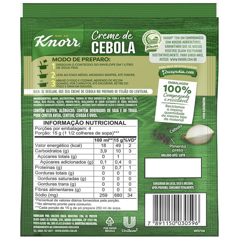 O Creme de Cebola Knorr é uma ótima opção de refeição saborosa, feito sem conservantes e com ingredientes desidratados e cuidadosamente selecionados, sem excesso de sal. De rápido e fácil preparo, você precisará de poucos minutos para preparar uma deliciosa sopa com Knorr. O Creme de Cebola Knorr é simples e versátil, podendo ser usado em uma variedade de outras refeições, dando uma cremosidade e sabor incomparável às suas almôndegas, hambúrguer, rocambole, feijão, lentilha ou ainda como base para uma saborosa sopa de legumes. Para preparar o produto é muito fácil: basta dissolver o conteúdo do envelope em 1 litro de água fria e levar ao fogo médio, mexendo sempre, até ferver. Em seguida, abaixe o fogo, deixe cozinhar por mais 3 minutos e pronto! Sua sopa de cebola já está pronta para ser consumida. Não precisa adicionar sal: os produtos foram desenvolvidos para ajudar o seu dia a dia na cozinha e seu creme de cebola já contará com todo o sabor e qualidade de Knorr. A linha de Sopas Knorr está disponível em mais 5 versões deliciosas que entregam o sabor e a praticidade ideais para o dia a dia corrido. Experimente! Acesse nosso site para ver outros produtos, receitas e informações.