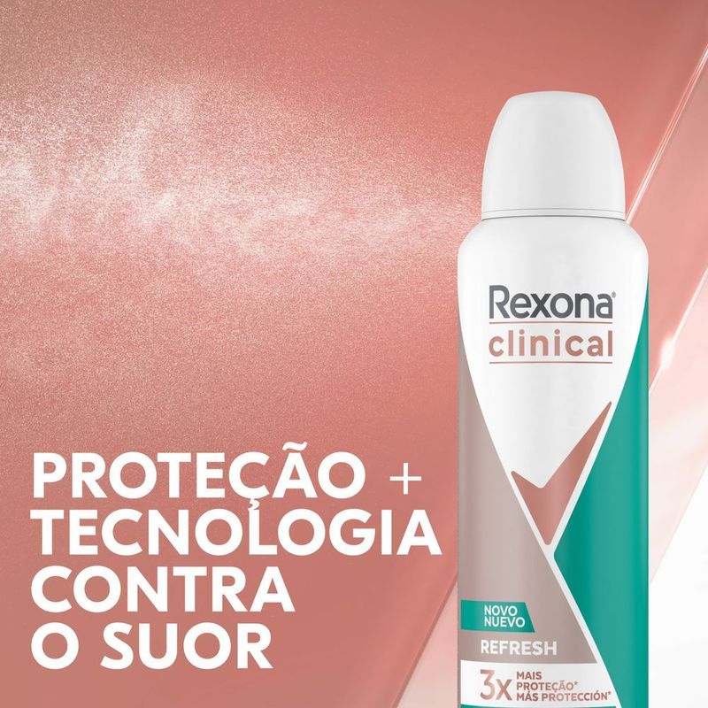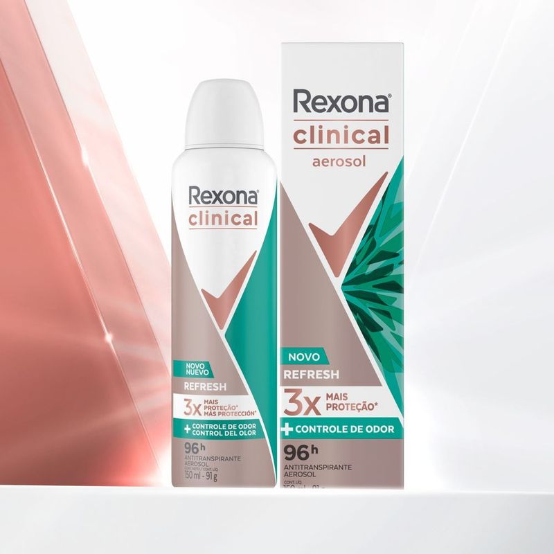 • O Antitranspirante Rexona Clinical Refresh garante 96 horas de proteção contra suor e mau odor • Esse desodorante antitranspirante protege 3x mais contra a transpiração excessiva* e odor corporal que um antitranspirante comum • O Desodorante feminino Rexona é um aerosol de alta performance com secagem rápida que a protege todos os dias • A fórmula de Rexona Clinical garante máxima proteção e não deixa manchas nem marcas em suas roupas • Desodorante aerosol com uma textura leve e uma fragrância refrescante, fácil de aplicar, para que se sinta sempre seca e limpa • Este desodorante Clinical Refresh está disponível no formato aerosol A transpiração e o mau odor podem ser uma limitação na vida de muitas pessoas, o sentimento de desconforto toma conta nessas situações. Pensando nisso, Rexona desenvolveu o desodorante Antitranspirante Aerosol Rexona Clinical Refresh, que protege 3x mais contra a transpiração excessiva* e odor corporal que um antitranspirante comum. Este antitranspirante possui ingredientes de alta performance que garantem 96 horas de proteção contra o suor, para se sentir sempre fresca, seca e limpa. Possui uma fórmula com textura leve e de secagem rápida, que não deixa manchas nem marcas em suas roupas. Para aplicar, agite bem antes de usar. Segure a lata a uma distância de 15 cm das suas axilas. Evite inalar diretamente. Aplique pequenas quantidades do produto em locais bem ventilados. Cada vez mais usamos materiais reutilizáveis em nossas embalagens, e facilitamos o descarte consciente da sua embalagem de desodorante para um planeta em movimento. É inofensivo para a camada do ozônio. A missão de Rexona é entender cada vez mais sobre a transpiração, e toda a linha de desodorantes antitranspirantes foi desenvolvida com tecnologia de ponta, para que você possa desafiar os seus limites diariamente. Disponível no formato desodorante feminino aerosol. Os produtos Rexona permitem você fazer mais, sem se preocupar com a transpiração. Rexona garante a melhor proteção contra a transpiração. Rexona Clinical, não te abandona! *vs. um antitranspirante básico.