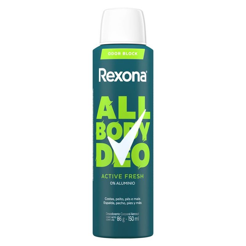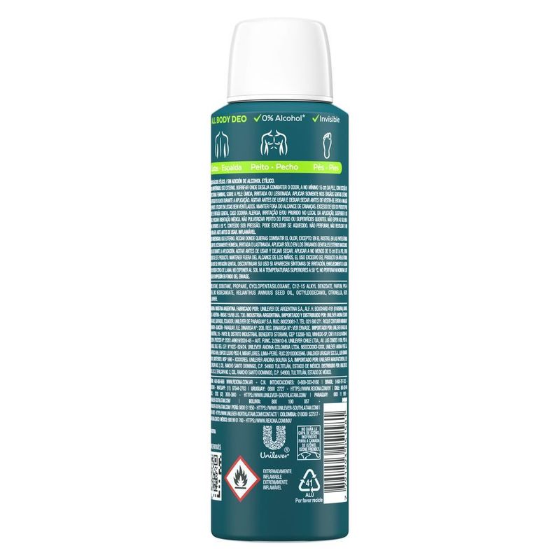 • Com o Desodorante Corporal Rexona All Body Deo Active Fresh você fica cheiroso no corpo todo • Desodorante masculino com tecnologia de bloqueio de odor que se adapta ao seu corpo • Desodorante corporal indicado para outras partes do corpo, como costas, pés, virilha, bumbum e mais. Consulte o modo de uso do produto • Desodorante corporal masculino com fórmula dermatologicamente testada • Uma nova etapa do cuidado com o corpo, desodorante 0% Alumínio e 0% Álcool etílico • Desodorante Aerosol Rexona All Body Deo Active Fresh possui fragrância cítrica e refrescante. Chegou o novo desodorante corporal Rexona All Body Deo, com tecnologia que se adapta ao seu corpo, eliminando bactérias causadoras de mau odor de cada região do corpo e bloqueando o odor antes mesmo que ele comece, garantindo que você se sinta fresco, cheiroso e confiante no corpo todo! O novo All Body Deo está disponível em dois formatos: o creme, especialmente desenvolvido para as partes íntimas; e aerosol para todas as demais partes do corpo, como costas, peito, coxas e até os pés! Uma nova etapa do cuidado com o corpo, com produtos dermatologicamente testados, sem alumínio e sem álcool etílico. O desodorante corporal Rexona All Body Deo Active Fresh em aerosol possui fragrância vibrante e revigorante de cítricos e notas florais modernas, proporcionando sensação de frescor duradouro. Para usar, basta aplicá-lo a pelo menos 15 cm da pele. Pulverize onde desejar combater o odor, evitando o rosto. Deixe secar antes de se vestir. Ele é leve e refrescante na pele, não deixa resíduos e seca rapidamente. O desodorante corporal de Rexona se adapta a você — onde quer que você precise — para que você possa superar seus limites. Com Rexona, queremos inspirar confiança em todos para se movimentarem mais e irem mais longe. Rexona não te abandona.