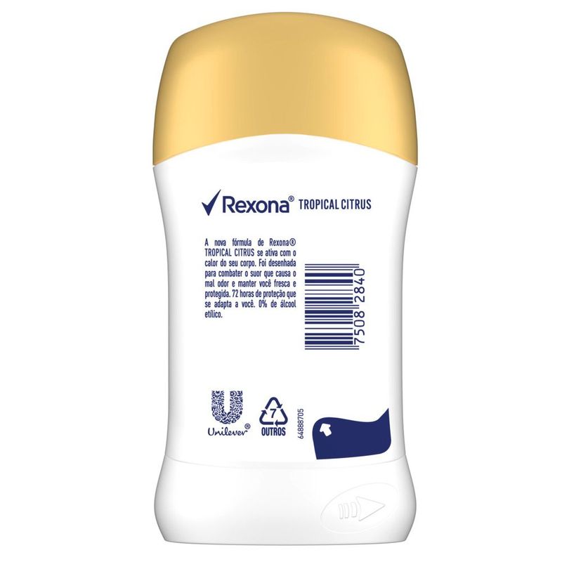 • O Antitranspirante Feminino em Barra Rexona Tropical Citrus possui fragrância cítrica e floral, garantindo a sensação de frescor durante o dia inteiro