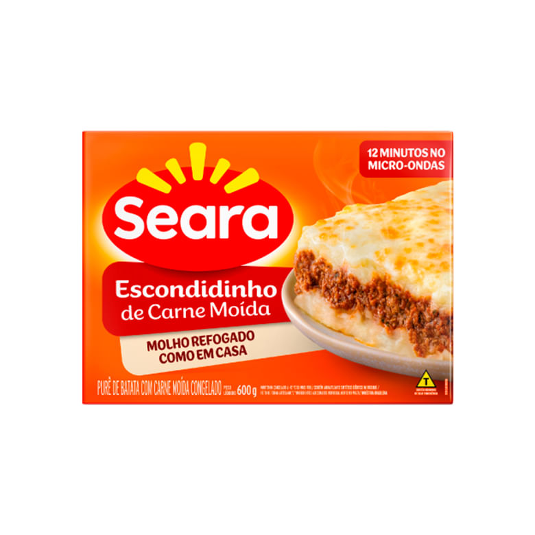 O escondidinho de carne moída Seara é preparado com carne bovina selecionada e moída no momento do preparo, refogada em um molho de tomate com alho, cebola e um leve toque de especiarias naturais. Além disso, o saboroso purê é feito com batatas e creme de leite.