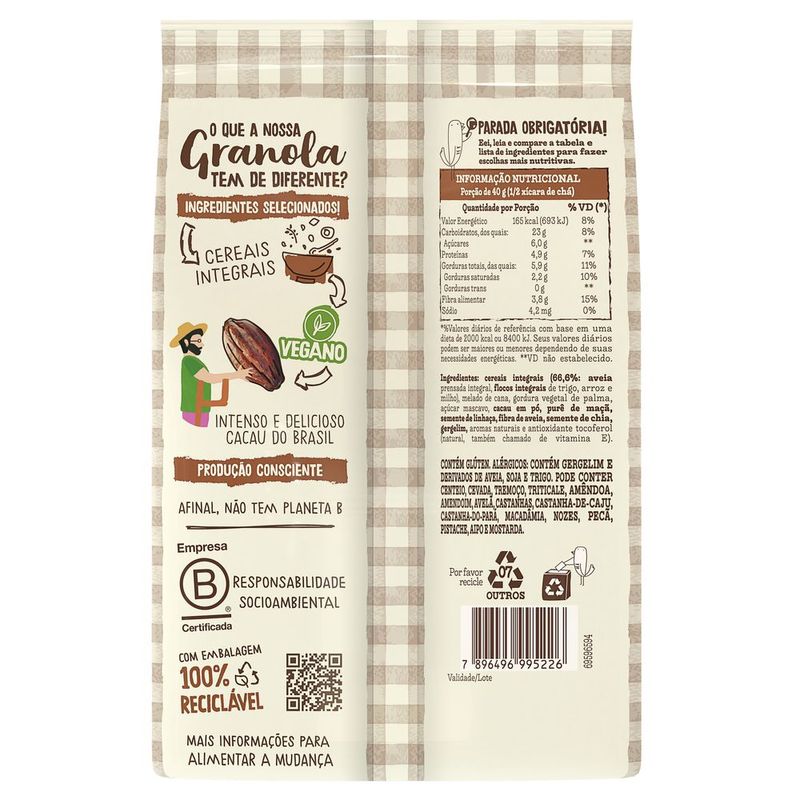Nossa Granola Mãe Terra Cacau é feita com cereais e sementes integrais, muuuito cacau e o nosso jeitinho mãe terráqueo de preparar uma granola gostosa, saudável e nutritiva! Além de ser crocante, deliciosa e vegana, esta granola é fonte de fibras. Ela é feita com grãos integrais, com aveia, linhaça, gergelim e chia e com ingredientes naturais, nativos do Brasil. Opção perfeita e crocante para um café da manhã saudável ou para o lanche, como preferir! Consuma com frutas, açaí, bebidas vegetais ou coma até mesmo pura. A Granola Mãe Terra Cacau combina com tudo! Fundada em 1979, a Mãe Terra é líder no segmento de alimentos naturais e orgânicos no Brasil. E é com muita alegria que podemos dizer que somos uma Empresa B, comunidade global de organizações que buscam o desenvolvimento socioambiental, além de econômico. Temos o desafio de crescer, mas sempre respeitando os limites da natureza, valorizando a preservação ambiental e com cuidado social. Ser parte desse movimento nos mostra que estamos no caminho certo. Afinal, tem que valer a pena levantar cedo. Nós, mãe-terráqueos, acreditamos que a mudança começa pelo nosso prato. Por isso, temos paixão em produzir alimentos naturais e orgânicos que mudam o corpo, a alma e a nossa mãe Terra. Os 7 princípios da Mãe Terra são: 1. Alimentos gostosos, feitos com afeto; 2. Integral de verdade, naturalmente nutritiva; 3. Orgânicos, cada vez mais; 4. Livres de transgênicos e pozinhos artificiais; 5. Privilegiando os pequenos produtores; 6. Valorizando os ingredientes nativos do nosso Brasil; 7. Vegana, aqui só tem ingredientes vegetais. Sabemos que não somos perfeitos, mas nos esforçamos para fazer nossa parte. Vamos juntes? #AlimenteaMudança