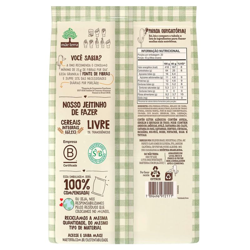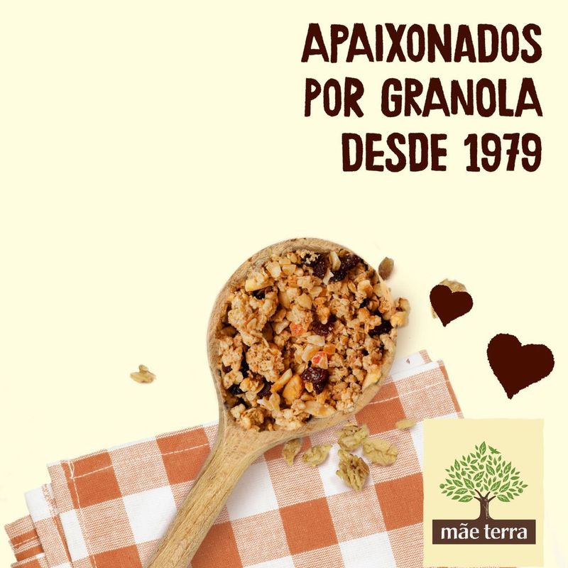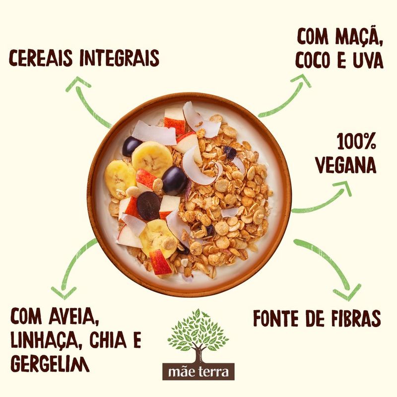 • A Granola Mãe Terra Frutas e Mel Vegano* é incrível para trazer um gostinho especial para o seu café da manhã, com muito sabor e sem ingredientes de origem animal • Comece seu dia com um café da manhã saudável e gostoso. A Granola Mãe Terra Frutas e Mel Vegano pode ser adicionada em frutas, iogurte, açaí ou como preferir • Somos apaixonados por granola de verdade desde 1979. Produzimos com afeto alimentos saudáveis, privilegiamos os pequenos produtores e valorizamos os ingredientes nativos do Brasil • Feita com cereais 100% integrais e grãos integrais, dentre eles aveia, chia, linhaça e gergelim • Granola Frutas e Mel Vegano é fonte de fibras, feita com ingredientes naturais e sem ingredientes geneticamente modificados • Nós, mãe-terráqueos, acreditamos que a mudança começa pelo nosso prato. Por isso, temos paixão em produzir alimentos naturais, saudáveis e orgânicos que mudam o corpo, a alma e a nossa mãe Terra Crocante, deliciosa e sem ingredientes com nomes esquisitos. Cereais e sementes integrais, linhaça, chia, gergelim e o jeito Mãe Terra de fazer. Essa é a Granola Frutas e Mel Vegano*. Levou anos, mas conseguimos desenvolver nossa fórmula especial. Nossa granola é fonte de fibras, feita com cereais 100% integrais, como aveia, chia, linhaça e gergelim, é livre de transgênicos e pozinhos artificiais. Opção perfeita para um café da manhã saudável e crocante ou para o lanchinho, como preferir! Consuma com frutas, açaí, bebidas vegetais ou coma até mesmo pura. A Granola Mãe Terra Frutas e Mel Vegano* combina com tudo! Fundada em 1979, a Mãe Terra é líder no segmento de alimentos naturais e orgânicos no Brasil. E é com muita alegria que podemos dizer que somos uma Empresa B, comunidade global de organizações que buscam o desenvolvimento socioambiental, além de econômico. Temos o desafio de crescer, mas sempre respeitando os limites da natureza, valorizando a preservação ambiental e com cuidado social. Ser parte desse movimento nos mostra que estamos no caminho certo. Afinal, tem que valer a pena levantar cedo. Nós, mãe-terráqueos, acreditamos que a mudança começa pelo nosso prato. Por isso, temos paixão em produzir alimentos naturais e orgânicos que mudam o corpo, a alma e a nossa mãe Terra. Os 6 princípios da Mãe Terra são: 1. Alimentos gostosos, feitos com afeto; 2. Integral de verdade, naturalmente nutritiva; 3. Orgânicos, cada vez mais; 4. Livres de transgênicos e pozinhos artificiais; 5. Privilegiando os pequenos produtores; 6. Valorizando os ingredientes nativos do nosso Brasil. 7. Vegana, aqui só tem ingredientes vegetais. Sabemos que não somos perfeitos, mas nos esforçamos para fazer nossa parte. Vamos juntes? #AlimenteaMudança *Esse produto é vegano e não contém mel de abelhas em sua composição