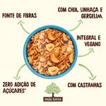 • Feita com 62,2% de flocos de cereais integrais, castanha-do-pará, castanha-de-caju, coco ralado, e sementes de chia, linhaça e gergelim