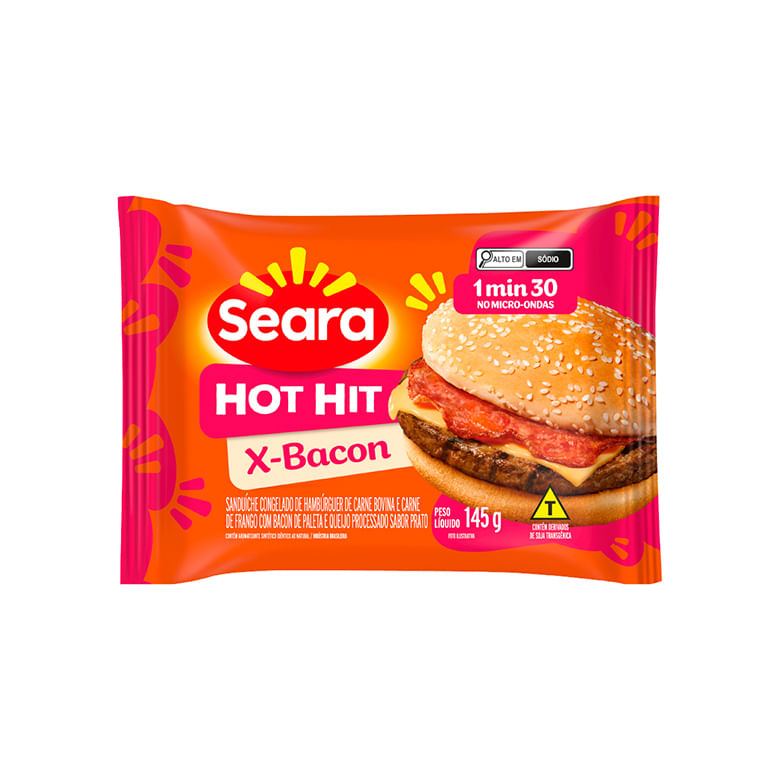 <p>O Hot Hit X-Bacon é um delicioso x-burguer com a perfeita combinação de queijo prato e Bacon Seara. Com um hambúrguer suculento e saboroso e um pão com gergelim super macio, não tem erro. Facinho de preparar, basta só 1:30min no micro-ondas para você matar a sua fome com um lanche sem igual no mercado!</p>