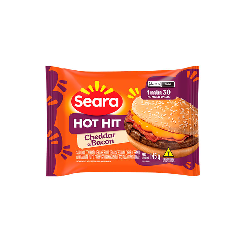 O Hot Hit cheddar e bacon é um delicioso x-burguer com a perfeita combinação de queijo cheddar e bacon Seara. Com um hambúrguer suculento e saboroso e um pão com gergelim super macio, não tem erro. Facinho de preparar, basta só 1:30min no micro-ondas para você matar a sua fome com um lanche sem igual no mercado!