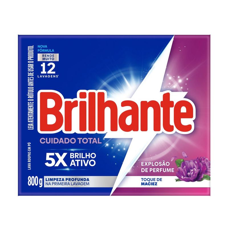 • O Sabão em Pó Brilhante Cuidado Total para lavar roupas garante mais perfume às suas roupas ao mesmo tempo que as deixa mais macias • Este detergente em pó para tecidos e roupas com amaciante encapsulado possui um material de longa duração, mantendo os tecidos macios e perfumados por mais tempo • Esta lava roupas em pó para roupas brancas e coloridas ajuda a melhorar o desgaste, mantendo-as com bom aspecto após cada lavagem • Brilhante Cuidado Total possui uma fórmula que contém o poder das enzimas, que proporciona uma limpeza profunda para suas roupas, prevenindo que a sujeira se deposite novamente • O sabão em pó Brilhante, com amaciante encapsulado, deixa suas roupas cheirosas com sua explosão de perfume e com toque de maciez incrível • Este detergente, indispensável em sua lavanderia, garante uma limpeza profunda desde a primeira lavagem de roupa, sem agredir os tecidos. O Sabão em Pó Brilhante Cuidado Total para lavar roupas combina os melhores resultados de limpeza e perfume com toque de maciez dos tecidos: de um lado, o poder das enzimas, que proporciona uma limpeza profunda ao mesmo tempo que evita que a sujeira volte a se depositar nas roupas; do outro, a tecnologia Amaciante Encapsulado que dá um toque de maciez e perfume para suas roupas. O Lava Roupas em Pó Brilhante Cuidado Total limpa profundamente sem agredir os tecidos enquanto ajuda a prevenir os sinais de desgaste das suas peças preferidas, deixando-as macias ao toque após cada lavagem de roupa. Mantenha as suas roupas suaves por mais tempo. Entre limpeza profunda e cuidado com as roupas? Escolha os dois! Com Brilhante em sua lavanderia, você sempre leva mais com a solução completa! Brilhante limpa as suas roupas brancas e coloridas enquanto entrega uma liberação de perfume e maciez. É um ativo concentrado poderoso: basta meia xícara de chá do produto para lavar uma máquina cheia. Brilhante quer tornar-se um aliado nas tarefas diárias de seus consumidores e busca trazer praticidade com produtos inovadores, que todo mundo possa usar, diminuindo o peso das tarefas e liberando tempo para as demais atividades do dia a dia.