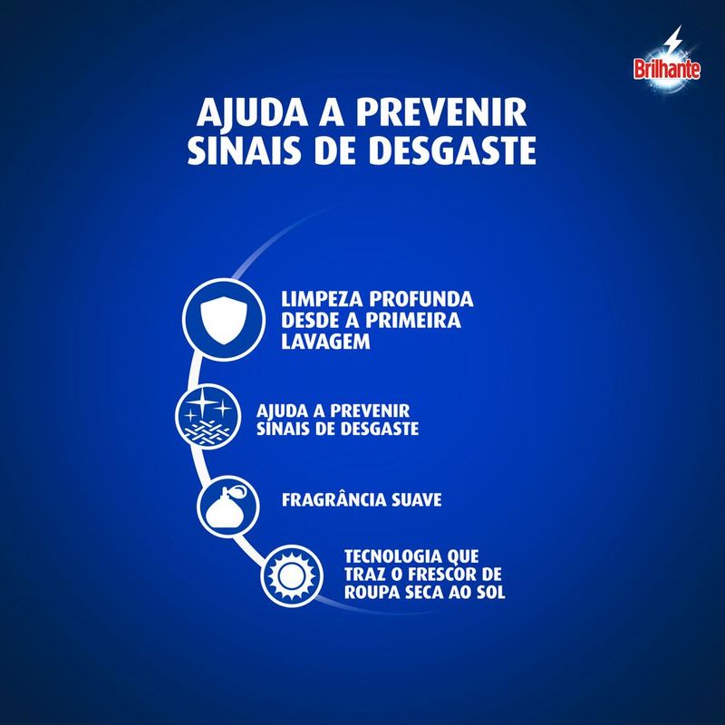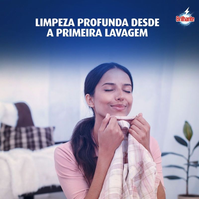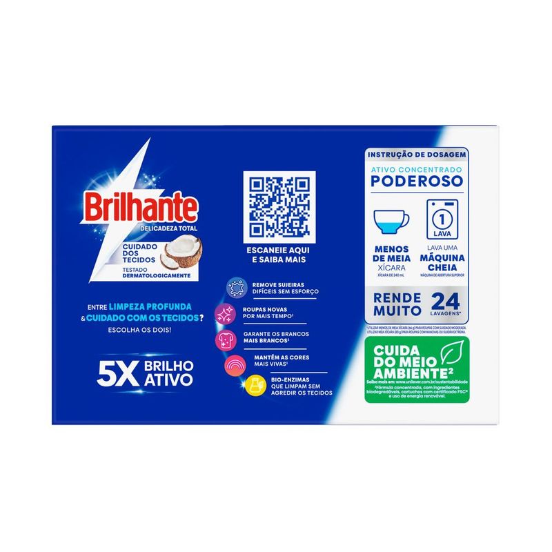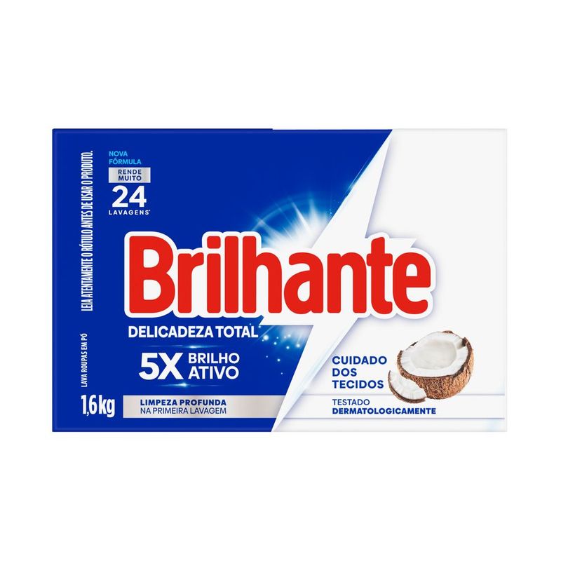 • O Sabão em Pó Brilhante Delicadeza Total para lavar roupas permite o cuidado dos tecidos • Este detergente em pó para tecidos e roupas possui tecnologia com óleo de coco que produz uma espuma suave, combinando o frescor de roupa seca ao sol • Este lava roupas, além de cuidar de suas roupas brancas e coloridas, é testado dermatologicamente e cuida da sua pele • Brilhante Delicadeza Total possui uma fórmula contendo o poder das enzimas, que proporciona uma limpeza profunda, evitando que a sujeira se deposite novamente • O Sabão em Pó Brilhante com o cuidado do coco tem fragrância suave e ajuda a prevenir sinais de desgaste, mantendo suas roupas novas por mais tempo • Este detergente, indispensável em sua lavanderia garante uma limpeza profunda desde a primeira lavagem de roupa, sem agredir os tecidos O Sabão em Pó Brilhante Delicadeza Total para lavar roupas combina os melhores resultados de limpeza com o cuidado dos tecidos: de um lado, o poder das enzimas, que proporciona uma limpeza profunda ao mesmo tempo que evita que a sujeira volte a se depositar nas roupas; do outro, a tecnologia com óleo de coco natural e fragrância suave, que traz o frescor de roupa seca ao sol. O Lava Roupas em Pó Brilhante Delicadeza Total limpa profundamente suas roupas sem agredir os tecidos, ajudando a prevenir os sinais de desgaste das suas peças preferidas após cada lavagem de roupa. Além de cuidar dos tecidos, cuida também de sua pele, pois é testado dermatologicamente. Entre limpeza profunda e o cuidado do coco? Escolha os dois! Com Brilhante em sua lavanderia, você sempre leva mais com a solução completa! Brilhante limpa as suas roupas brancas e coloridas enquanto cuida das cores. É um ativo concentrado poderoso: basta meia xícara de chá do produto para lavar uma máquina cheia. Brilhante quer se tornar um aliado nas tarefas diárias de seus consumidores e busca trazer praticidade com produtos inovadores, que todo mundo possa usar, diminuindo o peso das tarefas e liberando tempo para as demais atividades do dia a dia.