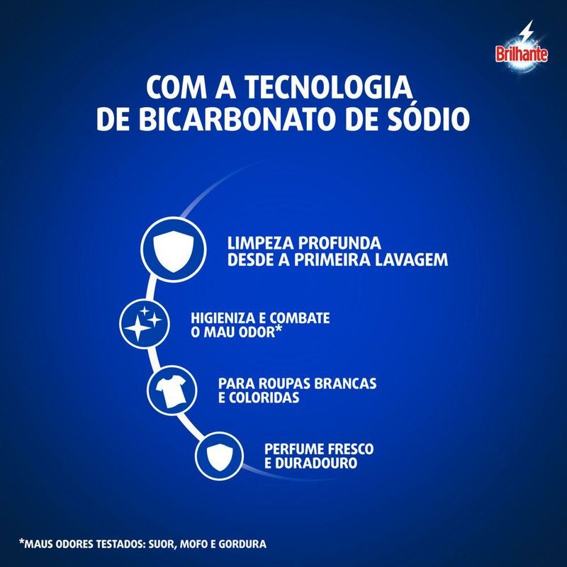 • O Lava Roupas Líquido Brilhante Higiene Total é composto por enzimas, evitando que a sujeira se deposite nas roupas e no tecidos • Sabão líquido que higieniza e combate o mau odor* do tecido • Este lava roupas possui bicarbonato de sódio em sua fórmula • O Lava Roupas Líquido Brilhante Higiene Total limpa suas roupas profundamente desde a primeira lavagem • Com o sabão líquido Brilhante, você sempre tem os melhores resultados de limpeza • Refil, 900 ml rende 9 lavagens. Com meio copo americano lava uma máquina cheia A nova fórmula do Lava Roupas Líquido Brilhante Higiene Total combina os melhores resultados de limpeza com a ação de combate ao mau odor* do tecido. Esse sabão líquido contém o poder das enzimas e do bicarbonato de sódio, proporcionando uma limpeza profunda desde a primeira lavagem, evitando que a sujeira se deposite nas roupas e no tecidos. Entre limpeza profunda e combate ao mau odor? Escolha os dois! Com o sabão líquido Brilhante, você leva sempre mais. Refil, 900 ml rende 9 lavagens, com apenas meio copo americano para lavar uma máquina cheia. Brilhante quer se tornar um aliado nas tarefas diárias de seus consumidores e busca trazer praticidade por meio de produtos inovadores e que todo mundo possa usar, diminuindo o peso das tarefas e liberando tempo para as demais atividades do dia a dia. Acesse o site da marca e saiba mais! Dicas: produtos lava roupas não devem ser misturados com produtos à base de cloro. Tempo de molho ideal: até 2 horas. Recomendado para a maioria dos tecidos e para roupas brancas e coloridas, mas em geral produtos lava roupas não são adequados para lavar lã, seda, couro e algodão cru. Seque suas roupas em local arejado. Para outros tipos de máquina de lavar, ajuste a dosagem de acordo com a recomendação do fabricante. *Maus odores testados: suor, mofo e gordura.