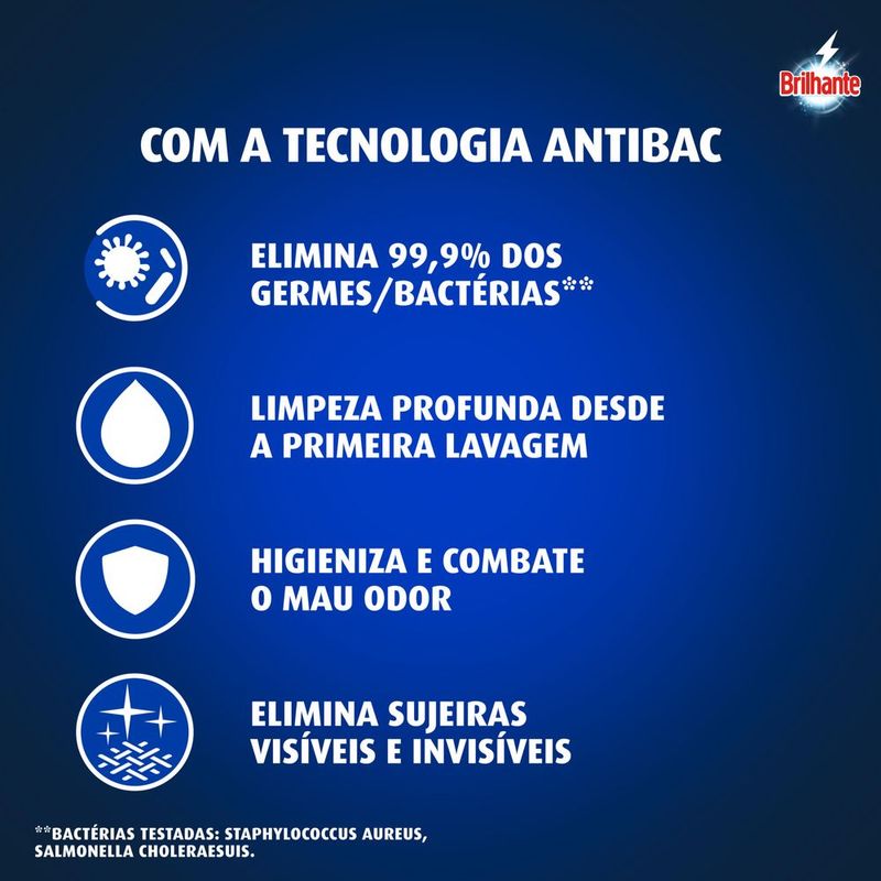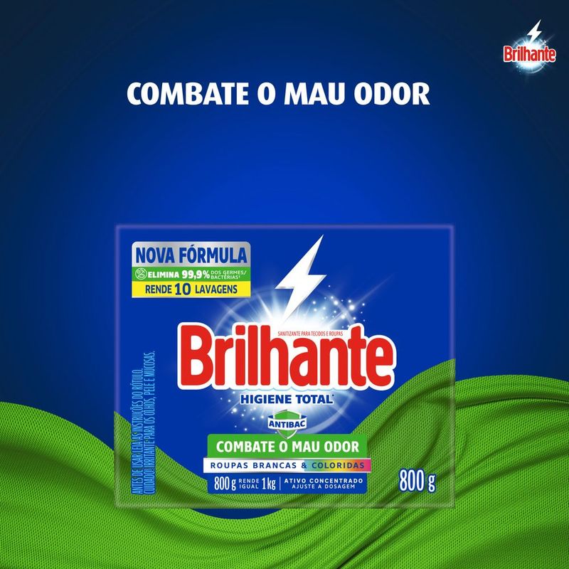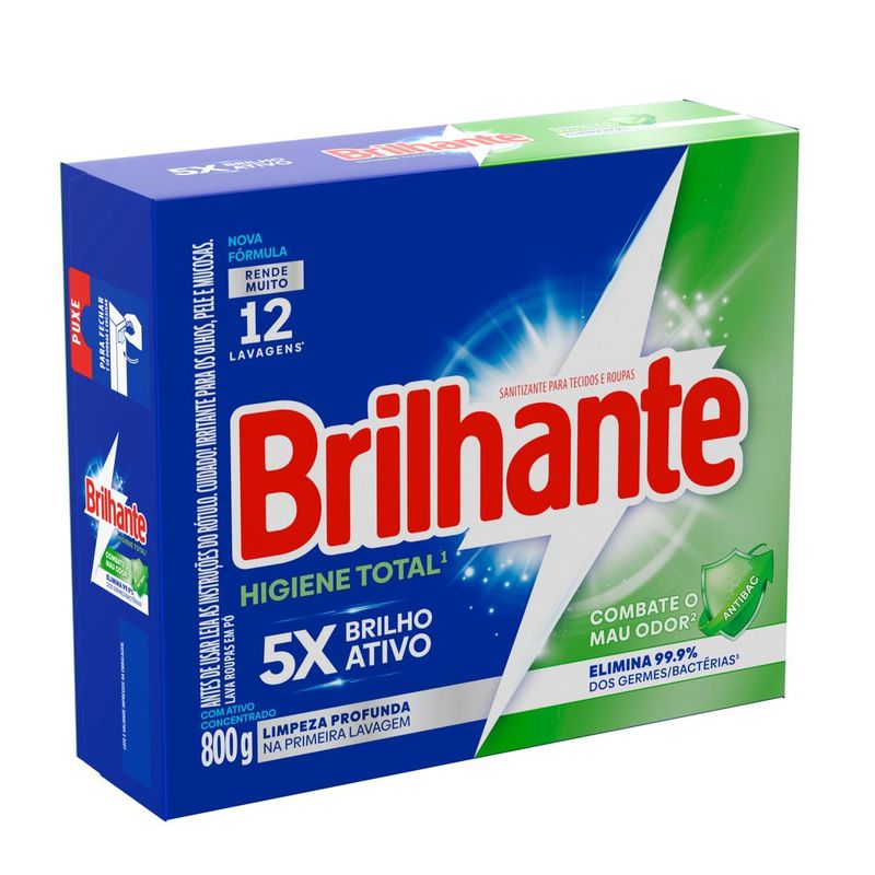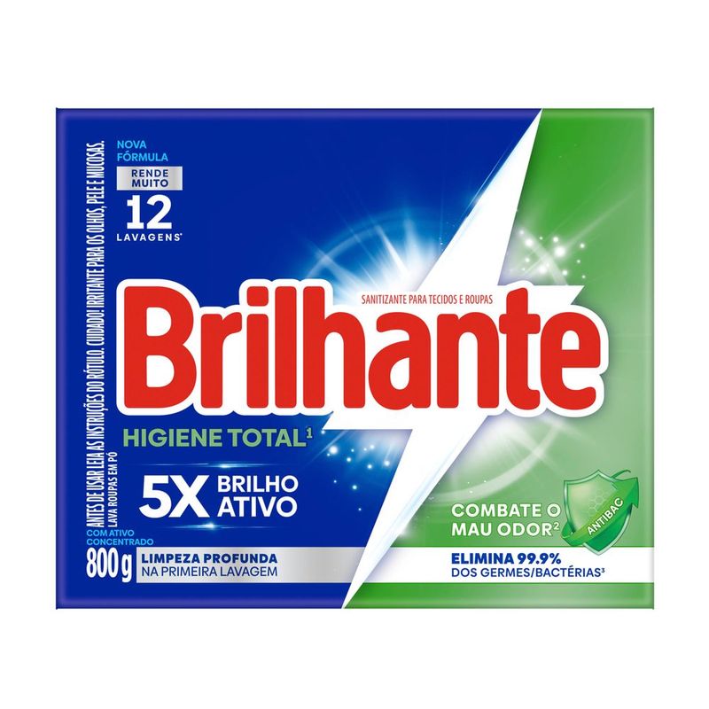 • Sanitizante em Pó Brilhante Higiene Total* para lavar roupas, com sua nova fórmula limpa suas roupas profundamente • O Sanitizante em Pó Brilhante garante uma limpeza profunda que elimina 99,9% de germes e bactérias** desde a primeira lavagem • Este lava roupas em pó, com bicarbonato de sódio em sua fórmula, deixa os brancos impecáveis, eliminando sujeiras visíveis e invisíveis • Brilhante Higiene Total*, com sua nova fórmula, limpa suas roupas profundamente • O Sanitizante em Pó Brilhante Higiene Total* elimina toda sujeira profundamente da roupas brancas e coloridas • Este detergente, indispensável em sua lavanderia, garante uma limpeza completa desde a primeira lavagem de roupa. O Sanitizante em Pó Brilhante Higiene Total* para lavar roupas combina os melhores resultados de limpeza com o combate aos maus odores: de um lado, o poder das enzimas, que proporciona uma limpeza profunda ao mesmo tempo que evita que a sujeira volte a se depositar nas roupas; do outro, a tecnologia Antibac, bloqueando o mau odor das roupas. O sabão em pó Brilhante Higiene Total* possui bicarbonato de sódio em sua composição, deixando os brancos ainda mais brancos, eliminando sujeiras visíveis e invisíveis. O Sanitizante em Pó Brilhante garante uma limpeza profunda que elimina 99,9% de germes e bactérias** desde a primeira lavagem de roupa. Entre limpeza profunda e combate ao mau odor? Escolha os dois! Com Brilhante em sua lavanderia, você sempre leva mais e ainda tem a solução completa! Brilhante limpa as suas roupas brancas e coloridas enquanto cuida das cores. É um ativo concentrado poderoso, basta meia xícara de chá do produto para lavar uma máquina cheia. Para ação Antibac, coloque 1 colher de chá (3g) do produto para cada litro de água e deixe a roupa de molho por uma hora. Este sabão em pó contém tensioativo biodegradável. Brilhante quer se tornar um aliado nas tarefas diárias de seus consumidores e busca trazer praticidade com produtos inovadores, que todo mundo possa usar, diminuindo o peso das tarefas e liberando tempo para as demais atividades do dia a dia. *Benefícios relacionados à limpeza profunda, higiene, combate do mau odor. **Bactérias testadas: Staphylococcus aureus, Salmonella choleraesuis.