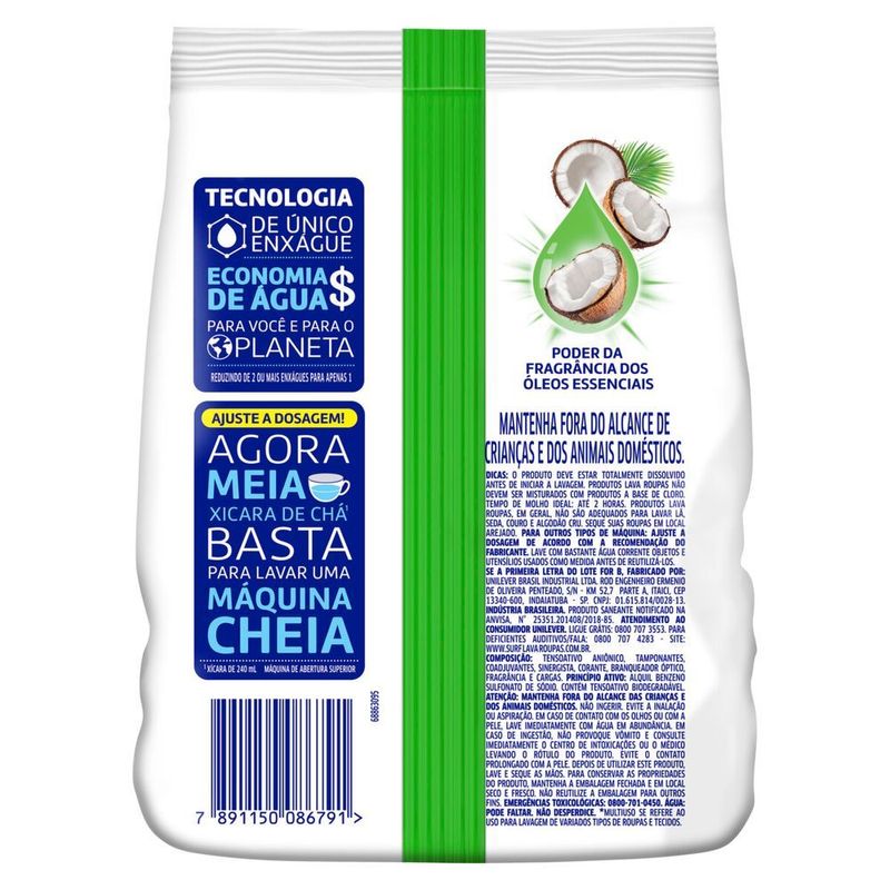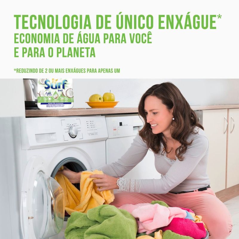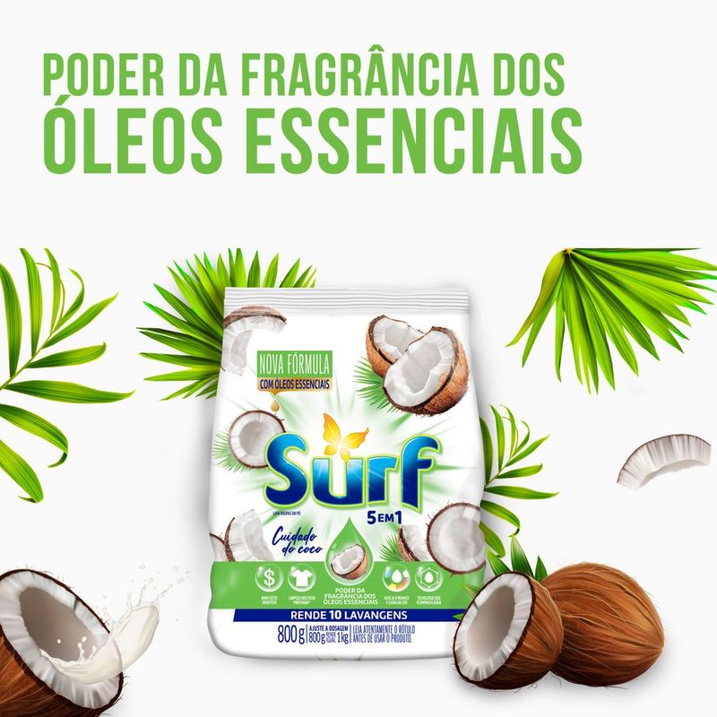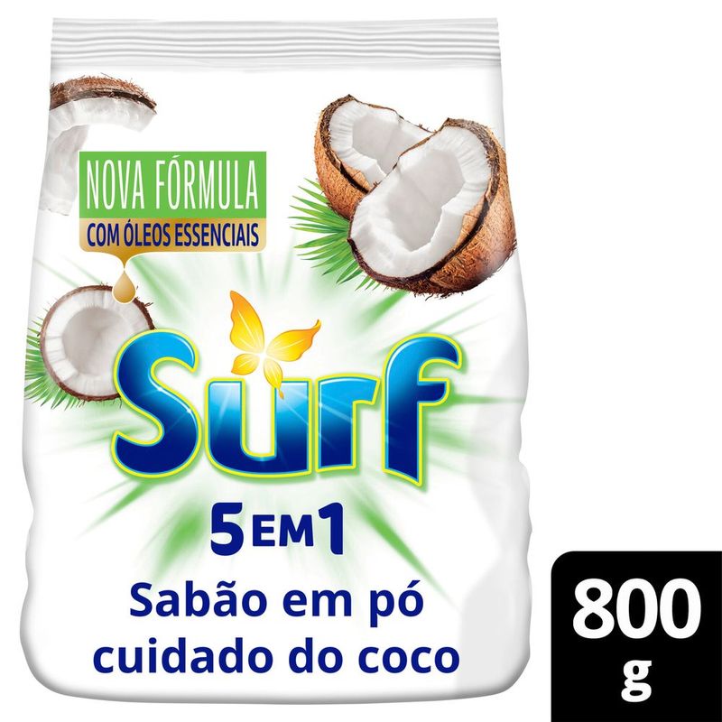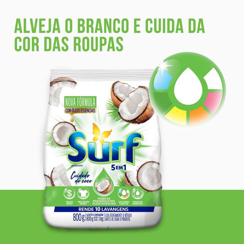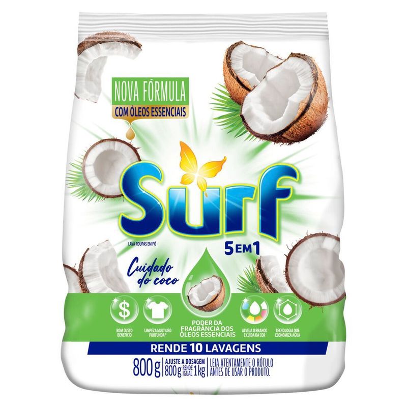 • O Sabão em pó 5 em 1 Surf Cuidado do coco te dá o poder de limpeza através da fragrância dos óleos essenciais e do toque refrescante do coco • Ele fornece uma fragrância intensa e duradoura, mantendo suas roupas com uma sensação de refrescância por muito mais tempo • O Sabão em pó 5 em 1 Surf Cuidado do coco consegue alvejar o branco e cuidar da cor das suas roupas ao mesmo tempo • Ajuste a dosagem! Agora meia xícara de chá* do sabão em pó basta para lavar uma máquina cheia • A marca Surf não está aqui apenas para lavar roupas, mas sim para ajudar você a se sentir confiante e confortável com você mesma • O Sabão em pó Surf 5 em 1 Cuidado do coco está disponível no tamanho 800 g em uma embalagem branca como o interior de um delicioso coco! O Sabão em pó Surf 5 em 1 Cuidado do coco te dá muitos benefícios por menos! Em um único sabão em pó para lavar roupas você encontra poder de limpeza, fragrância intensa e duradoura, e bom custo-benefício, que alveja o branco, tira manchas e cuida da cor! Todos os benefícios a um preço acessível! Experimente a sensação de roupa recém-lavada e limpa com o Sabão em pó Surf 5 em 1 Cuidado do coco. Sua fórmula oferece a solução completa e foi desenhada para entregar tudo o que você espera de um sabão em pó em um produto fácil e simples de usar. A marca Surf não está aqui apenas para lavar roupas, mas sim para ajudar você a se sentir confiante e confortável com você mesma. Ajuste a dosagem: Surf 5 em 1 agora vem com a nova tecnologia de único enxágue que economiza água, é concentrado e rende muito! Economia de água para você e para o planeta! Com apenas 1/2 xícara de chá* você lava uma máquina cheia! Os produtos lava-roupas da Surf vêm em três formatos diferentes para você escolher. São eles: o sabão em pó nos tamanhos de 800 g, 1,6 kg e 2,2 kg, e também o sabão líquido com 3 L e 5 L. *Xícara de 240 ml