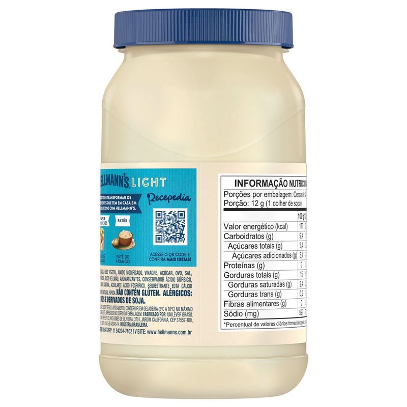 • Maionese Hellmann's Light 500g: o mesmo sabor e cremosidade da tradicional, com 43% menos calorias*. (*Comparado ao alimento de referência do mesmo fabricante.)