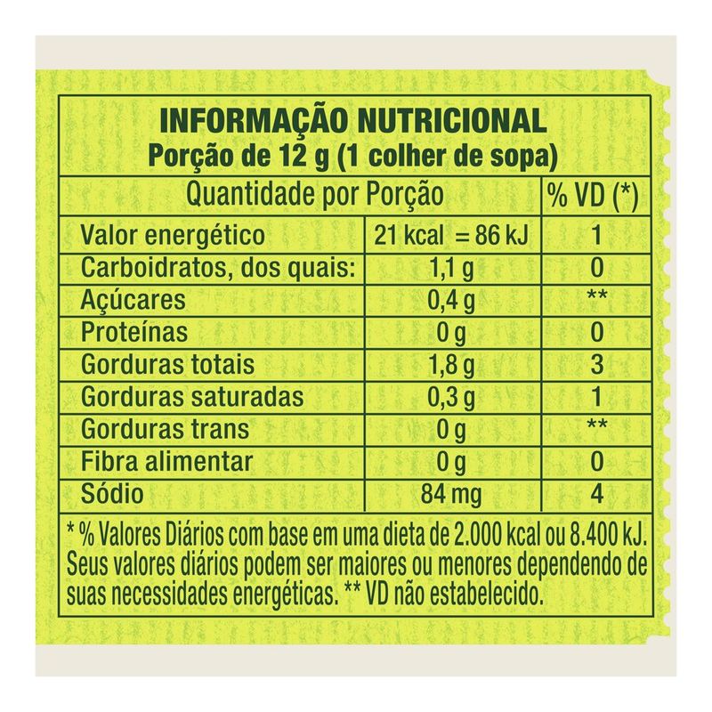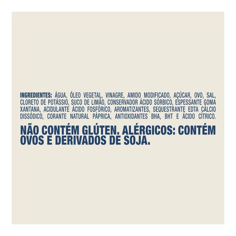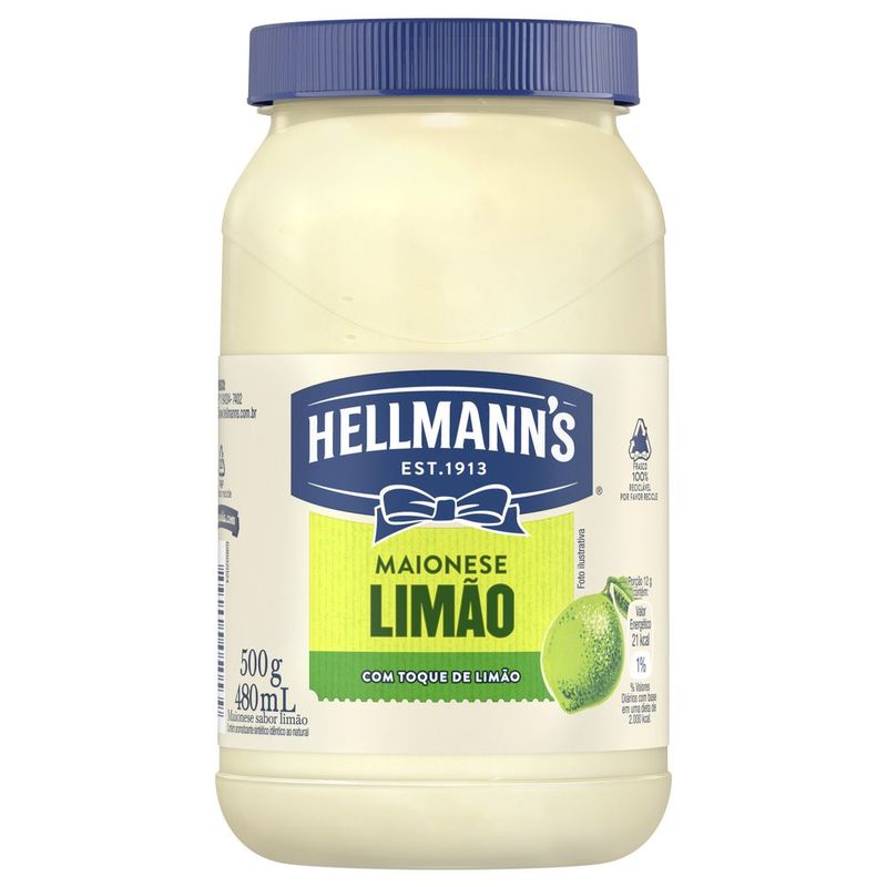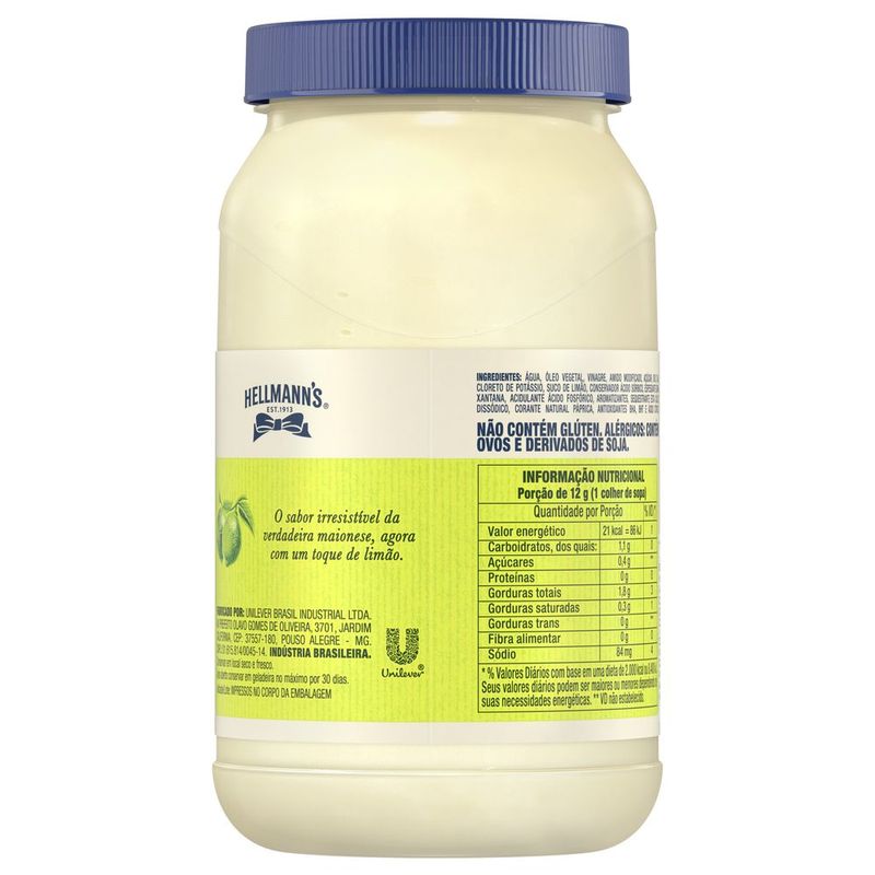 • A Maionese Hellmann's Limão adiciona o autêntico toque cítrico do limão a nossa já deliciosa maionese tradicional • Com ingredientes de alta qualidade cuidadosamente selecionados e óleo de soja, sendo este óleo fonte de ômega 3 e 6 • Cada pote de Maionese Hellmann's Limão é 100% reciclável, por favor recicle! • Feita com ovos caipiras e não contém glúten • Com a nossa maionese Hellmann's Limão você sempre estará preparado para transformar de uma maneira rápida e fácil o que resta na sua geladeira em deliciosas refeições • Sem ideias do que fazer com os ingredientes que serão desperdiçados? Não os desperdice. Com Hellmann’s, tudo fica com mais sabor. Veja as nossas receitas! Gosta de um toque de limão em suas refeições? Então essa maionese é para você! A Maionese Hellmann’s Limão possui um sabor autêntico. Com um toque cítrico, a Maionese Verde Hellmann’s entrega o sabor para tornar todos os lanches e pratos ainda mais deliciosos e cremosos. A Maionese Limão Hellmann's contém 21 calorias por colher de sopa (12 g), possui ômega 3 e 6, provenientes do óleo de soja, e não contém glúten, resultando em um produto delicioso e mais saudável. É a perfeita combinação para seus hambúrgueres, batatas fritas, acompanhamento de salada de maionese, churrasco, frutos do mar, wraps, lanches, um molho diferente ou até mesmo com o petisco e combinações de molhos para receber os amigos e familiares. Combine suas receitas com a Maionese Hellmann's Limão e garanta uma explosão de sabor inesquecível! Hellmann's transforma todos os pratos em momentos únicos, rápidos, saborosos e especiais. Experimente você também e delicie-se com essa nova receita de maionese pronta! Nós na Hellmann's acreditamos que o segredo para o sabor está nos ingredientes que você utiliza em suas receitas. Por isso, nos dedicamos a oferecer uma cremosidade sem igual e utilizamos somente ingredientes de alta qualidade, como ovos caipiras e óleo de soja, para criar uma maionese que proporcione aos nossos consumidores um sabor irresistível e sem comparação. Cada frasco é 100% reciclável, cuidando do meio ambiente enquanto deixa seus pratos muito mais saborosos. Mais sabor, menos desperdício. A comida é importante demais para ser desperdiçada, por isso na Hellmann’s investimos na versatilidade de nossos produtos. Isso permite que você transforme o que restou em sua geladeira em verdadeiras e deliciosas refeições. Inspire-se com as nossas receitas. Com a Maionese Limão Hellmann's nada se desperdiça, tudo se aproveita. Experimente você também! Mais que sabor, sabor Hellmann's!