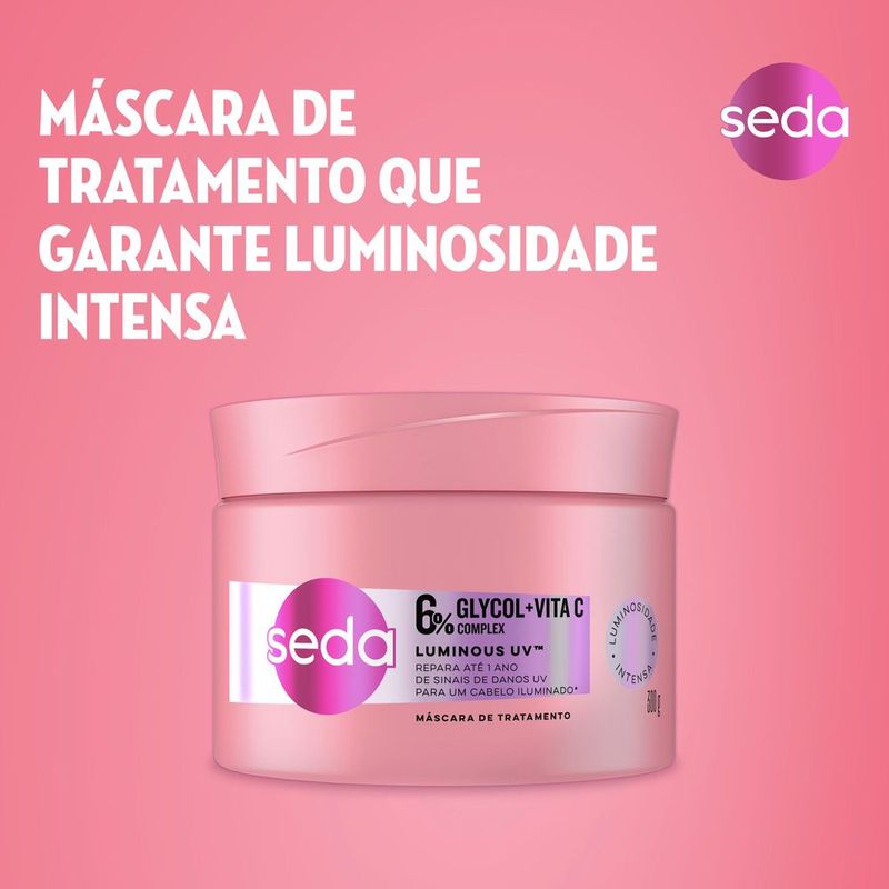 Nova máscara de tratamento Seda Luminous UV com 6% Glycol + Vita C Complex com textura ultra cremosa. Repara até 1 ano de sinais de danos UV para um cabelo iluminado*. Brilhe com a nova Máscara de Tratamento Condicionante Seda Luminous UV! Nossa fórmula exclusiva com Glycol + Vita C Complex repara intensamente até 1 ano de sinais de danos UV*, para cabelos protegidos e com um brilho excepcional, mesmo sob o sol brilhante! O complexo de 6% Glycol + Vita C sela as cutículas, repara os sinais de danos causados pelos raios UV, deixa o cabelo com a aparência mais saudável e ativa a luminosidade. Modo de uso: com os fios umidos, aplique sobre todo o cabelo até as pontas (evite a raiz!), passando mecha a mecha de cima para baixo. Deixe por 1 minuto e depois enxágue. Use a linha completa Seda Luminous UV para cabelos com brilho e iluminados por mais tempo, um regime completo para todos os tipos de cabelo. Além de oferecer reparação e proteção dos sinais de danos UV, a linha conta com uma fragrância envolvente, uma explosão revigorante de frutas cítricas, criando uma fragrância luminosa e cintilante. *Dano à suavidade e resistencia à quebra comparado com shampoo sem agentes condicionantes.