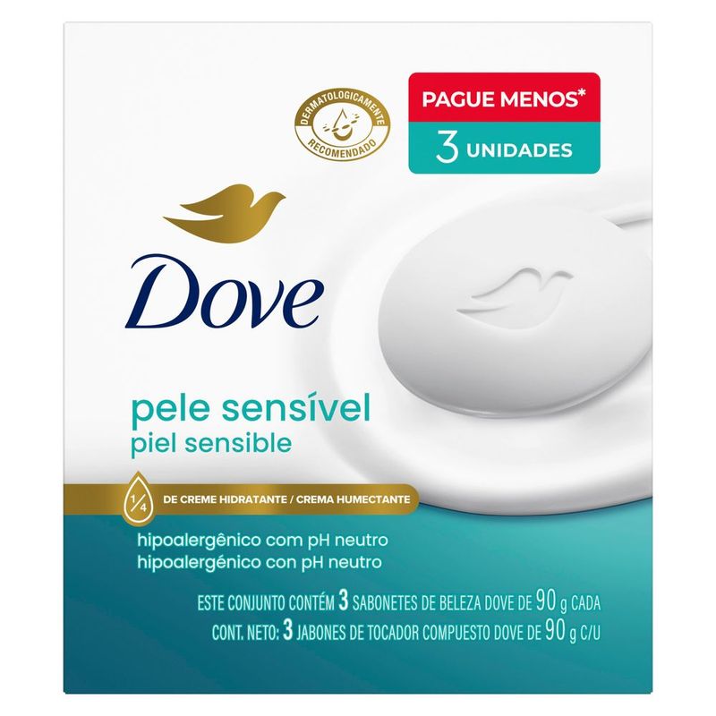 Dove não é um sabonete em barra comum, é uma barra de beleza que vai além da limpeza, nutrindo a pele enquanto remove a sujeira do dia a dia. Acreditamos que o segredo para uma pele bonita é a hidratação diária, e nenhum sabonete comum hidrata melhor do que Dove. Este sabonete em barra combina uma fórmula de limpeza suave com 1/4 de creme hidratante e glicerina, deixando a sua pele mais macia, bem cuidada e com a aparência saudável. Dove Pele Sensível contém pH neutro, não interferindo no próprio pH da pele e ajudando a manter a sua barreira de proteção natural. A barra de beleza Dove Pele Sensível possui fragrância suave e fórmula hipoalergênica. Com 0% sulfatos, parabenos e alergênicos, o sabonete Dove Pele Sensível é tão suave quanto a água, para cuidar até das peles mais sensíveis. Para uma melhor experiência no banho, sugerimos o seguinte modo de uso: primeiro, molhe as mãos e passe o Sabonete em Barra Dove Pele Sensível entre elas, até formar uma espuma. Em seguida, massageie a espuma pelo seu corpo e, por último, enxágue com água morna. O Sabonete Dove Pele Sensível não vai deixar a sua pele seca e áspera como os sabonetes comuns fazem, e você pode usá-lo diariamente no rosto, mãos e no corpo. Este sabonete é dermatologicamente recomendado. Dove é certificada Cruelty-Free pela PETA, sendo assim, não realizamos e nem realizaremos testes em animais em nenhum lugar do mundo.