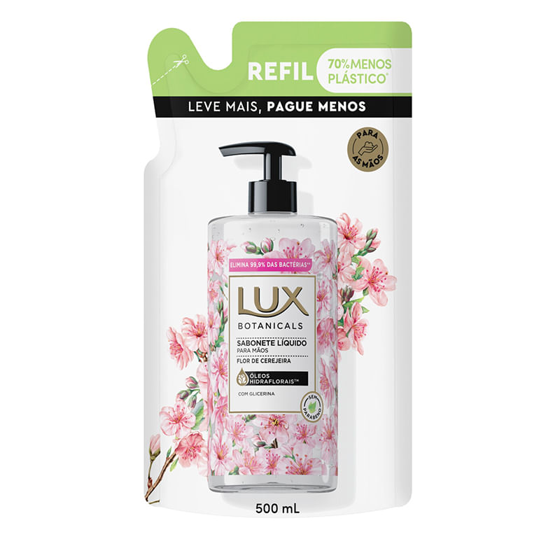 • Sabonete Líquido Refil Lux Botanicals Flor de Cerejeira possui uma fragrância única, especial e relaxante • Este sabonete líquido elimina 99,9% das bactérias** • Experimente o Sabonete Líquido Lux Botanicals Flor de Cerejeira e desfrute de mãos suaves e delicadamente perfumadas • Sua fórmula contém glicerina e óleos hidraflorais, ingredientes conhecidos pelas propriedades altamente hidratantes • A opção refil possui 70% menos plástico* contribuindo para um planeta mais sustentável • Com o nosso sabonete refil, você escolhe sustentabilidade e economia. Ao se juntar a esse movimento pelo planeta, está fazendo uma escolha inteligente para o seu bolso Sinta a espuma cremosa e a delicada fragrância do Sabonete Líquido Refil Lux Botanicals Flor de Cerejeira para mãos suaves e delicadamente perfumadas. Sua fórmula foi especialmente desenvolvida para proporcionar uma proteção que elimina 99,9% das bactérias**. A fragrância de Flor de Cerejeira contém Óleos Hidraflorais, uma combinação de extratos de flores e óleos essenciais extraídos da natureza, que ajuda no cuidado da pele contra o ressecamento, deixando-a delicadamente macia ao toque. Além disso, o Sabonete Líquido Refil Lux Botanicals Flor de Cerejeira contém glicerina, ingrediente conhecido pelas propriedades altamente hidratantes. Experimente as outras fragrâncias dos refis corporais e para as mãos de Lux Botanicals: Rosas Francesas, Erva Doce, Buquê de Jasmim e Capim-Limão. Os novos refis possuem 70% menos plástico* contribuindo para um planeta mais sustentável, e ainda garantem benefícios como: mais conveniência, facilidade ao refilar sem desperdício e o melhor custo-benefício. Com os nossos refis, você não precisa mais escolher entre produtos sustentáveis ou econômicos. Ao se juntar a esse movimento pelo planeta, você também está fazendo uma escolha inteligente para o seu bolso. *Redução de, pelo menos, 70% de plástico, comparado com a embalagem original. **Com base em estudo realizado em laboratório independente. Bactérias testadas: S.Aureus. Produto cosmético sem ação terapêutica.