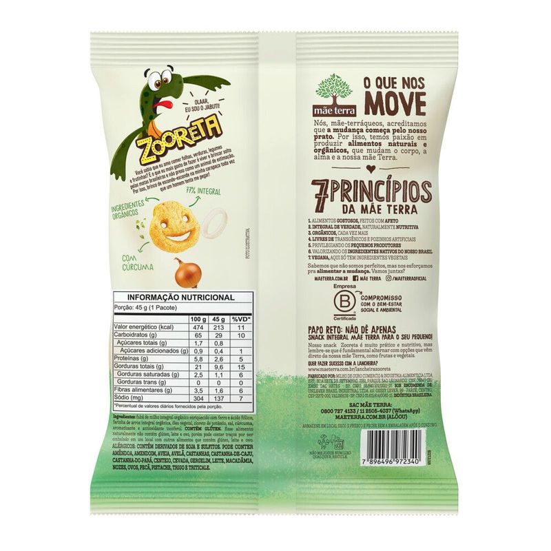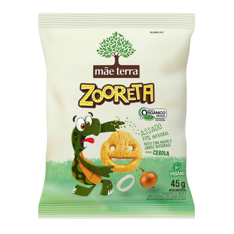 • O Salgadinho Mãe Terra Zooreta Cebola é uma excelente opção para colocar na lancheira das crianças e muito prático para levar em passeios ou viagens, garantindo uma alimentação saudável e deliciosa