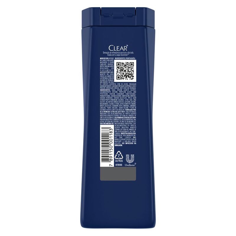 • O Shampoo Anticaspa Clear Men Ice Cool Menthol foi desenvolvido para homens, pois o couro cabeludo do homem está mais propenso a caspa • Com tecnologia Bio Booster que ajuda a ativar a proteção natural do couro cabeludo, acabando com a caspa recorrente* • Com mentol refrescante, este shampoo deixa o couro cabeludo com sensação de refrescância que dura o dia todo • Este shampoo masculino para uso diário é indicado para homens com couro cabeludo oleoso e irritado • O Shampoo Anticaspa Ice Cool Menthol protege o couro cabeludo, nutrindo-o, além de proporcionar uma sensação intensa de refrescância e remoção da oleosidade • O Shampoo Clear Men fortalece o couro cabeludo e acaba de vez com a caspa, deixando seu cabelo saudável e com sensação refrescante O Shampoo Anticaspa Clear Men Ice Cool Menthol, foi desenvolvido para homens, porque o couro cabeludo do homem está propenso a caspa. Formulado com Bio Booster, a nova tecnologia inteligente que ajuda a ativar a proteção natural do couro cabeludo e acaba com a caspa recorrente*. Este shampoo anticaspa com mentol refrescante, deixa o couro cabeludo com sensação de refrescância que dura o dia todo. O shampoo Ice Cool Menthol é indicado para homens com o couro cabeludo oleoso e irritado. Ele protege o couro cabeludo, nutrindo-o, além de proporcionar uma sensação intensa de refrescância e remoção da oleosidade, para um visual perfeito. Aplique no cabelo molhado, massageie o couro cabeludo e enxágue. Repita. Para melhores resultados, use diariamente. Quanto mais se esforça, mais seu corpo irá protestar. O suor e a umidade em um dia intenso ou após a prática de esportes, podem deixar você com um couro cabeludo com coceira, o que possivelmente ajudará no aparecimento da caspa. Em Clear Men, queremos inspirar as pessoas a mostrar ao mundo do que são feitas, ajudando-as a se tornarem resilientes, eliminando ansiedades e dúvidas. Que tenham a confiança para dar o seu melhor! Por isso, os Shampoos Clear foram desenvolvidos para fortalecer o couro cabeludo e acabar de vez com a caspa, além de proporcionar uma sensação refrescante que dura o dia todo. Clear, nada a esconder! *livre de escamas visíveis com o uso regular.