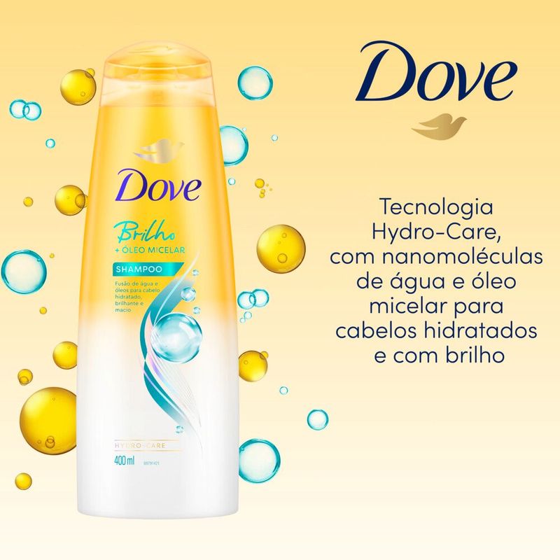 • O Shampoo Hidratação Dove Brilho possui nano-moléculas de água + óleo micelar para um cabelo brilhante e macio • Com nano-moléculas de água e óleo micelar, proporciona hidratação para cabelo com um brilho fantástico e sem pesar • Possui tecnologia Hydro-Care, com nano-moléculas de água, que permite que os ingredientes ativos cheguem às áreas mais ressecadas da fibra dos cabelos para uma hidratação profunda e sem pesar • Shampoo hidratante que limpa e hidrata os cabelos deixando-os com extra brilho a cada lavagem • Esse shampoo de brilho com nano-moléculas de água e óleo micelar, deixa os cabelos brilhosos, leves e macios • Com o uso da linha Dove Brilho seus cabelos vão ficar mais saudáveis, com brilho e vão receber uma hidratação profunda diariamente O Shampoo Dove Brilho faz parte da nova linha de hidratação de Dove, que hidrata profundamente o cabelo deixando-o mais leve, suave e brilhante. Sua fórmula com a fusão de nano-moléculas de água e óleo micelar oferece hidratação para cabelo com brilho e maciez. Este shampoo hidratante possui tecnologia Hydro-Care, com nano-moléculas de água, que permite que os ingredientes ativos cheguem às áreas mais ressecadas da fibra do cabelo para uma hidratação profunda e sem pesar. Shampoo Hidratação Dove Brilho, além de limpar, proporciona hidratação intensa aos cabelos com mais leveza, deixando-os fluidos e suaves, com movimento natural, extra brilho e efeito espelho. Com nano-moléculas de água e óleo micelar, este shampoo hidratante deixa os cabelos sedosos, bonitos e com brilho a cada lavagem. Shampoo de hidratação especialmente recomendado para cabelos com danos leves, esta linha possui princípios ativos feitos para suprir as suas necessidades. Para usar, massageie sobre os cabelos molhados e enxágue. Aplique novamente se necessário. Use toda a linha Dove Brilho para potencializar os resultados - Shampoo Dove Brilho e Condicionador Dove Brilho nos tamanhos 200 ml e 400 ml. Dove não realiza testes em animais, sendo seus shampoos certificados como Cruelty-Free pela PETA. Dove Hydro-Care, a hidratação ideal para seu cabelo.