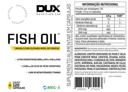 DUX Fish Oil é uma fórmula avançada de ômega-3, ultra-puro e altamente potente. Feito com óleo de sardinha e salmão, é o óleo perfeito para sua máquina mais importante: seu corpo.